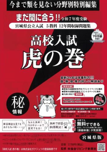パターン別にしっかり取り組み傾向を掴めるように、宮城県立の入試問題10年分を分析し分野別に編集しました! 数学でいえば、【計算】を12年間分、【関数】を12年間分、【平面図形】を12年間分・・・と、それぞれの単元分野でまとめ直しているので、集中して特訓ができます。 その為より早く出題傾向に慣れ、入試レベルでの練習ができます。 こうすることによってより早く出題傾向に慣れ、入試レベルでの練習ができます。 入試までの少ない期間を有効に使うには、苦手なところ(学習したいところ)の単元の過去問を集中してこなすこと!これが一番です!それが【受験生の合格への近道】です。 ●教科別に見てみると 数学…◎ 得に文章問題が多く【関数】についても文章量が多いので解きなれておこう! ◎【証明】問題も解答は全て『記述』です!練習あるのみ! 国語…◎【文法・語法】の問題が出題! 他の問題集には、このような問題が少ないのでココでしっかりおさえよう! 社会…◎【地理と歴史】が複合問題として出題されているので、このパターンに慣れておこう! ・・・といった出題傾向が見えてくる!